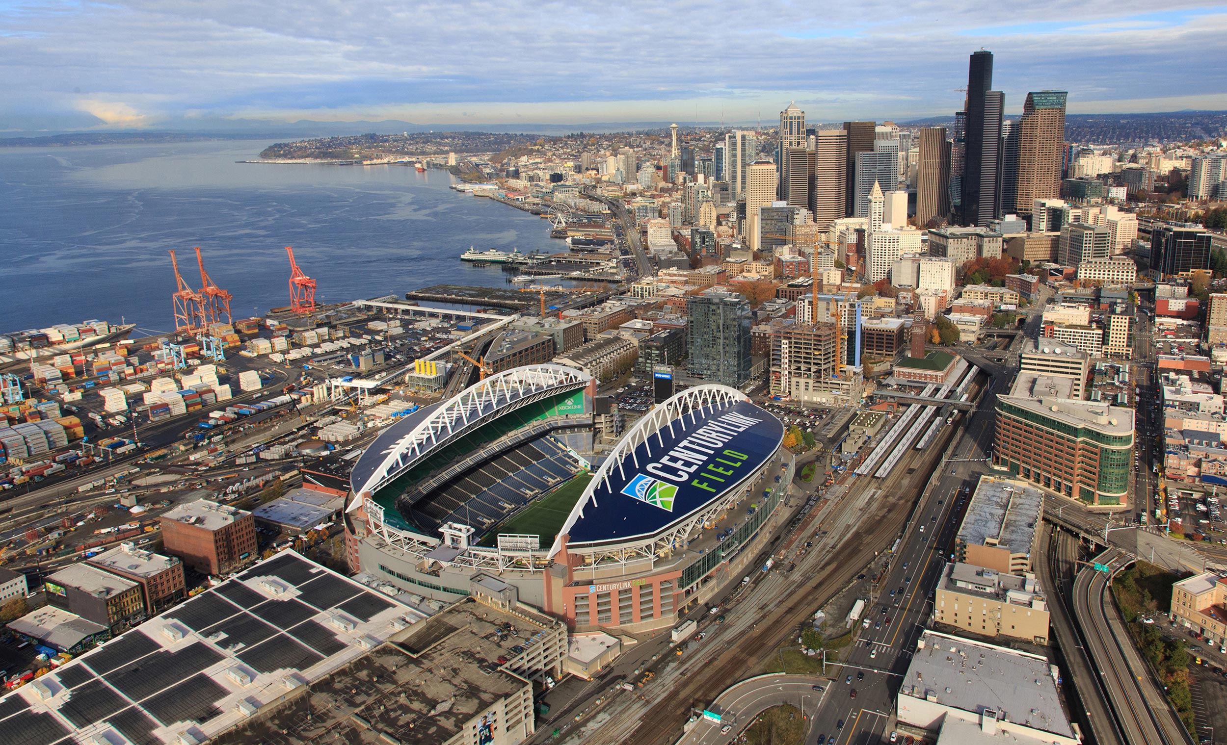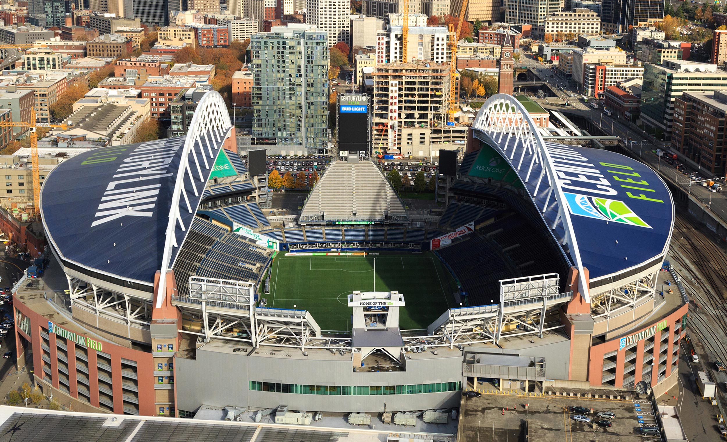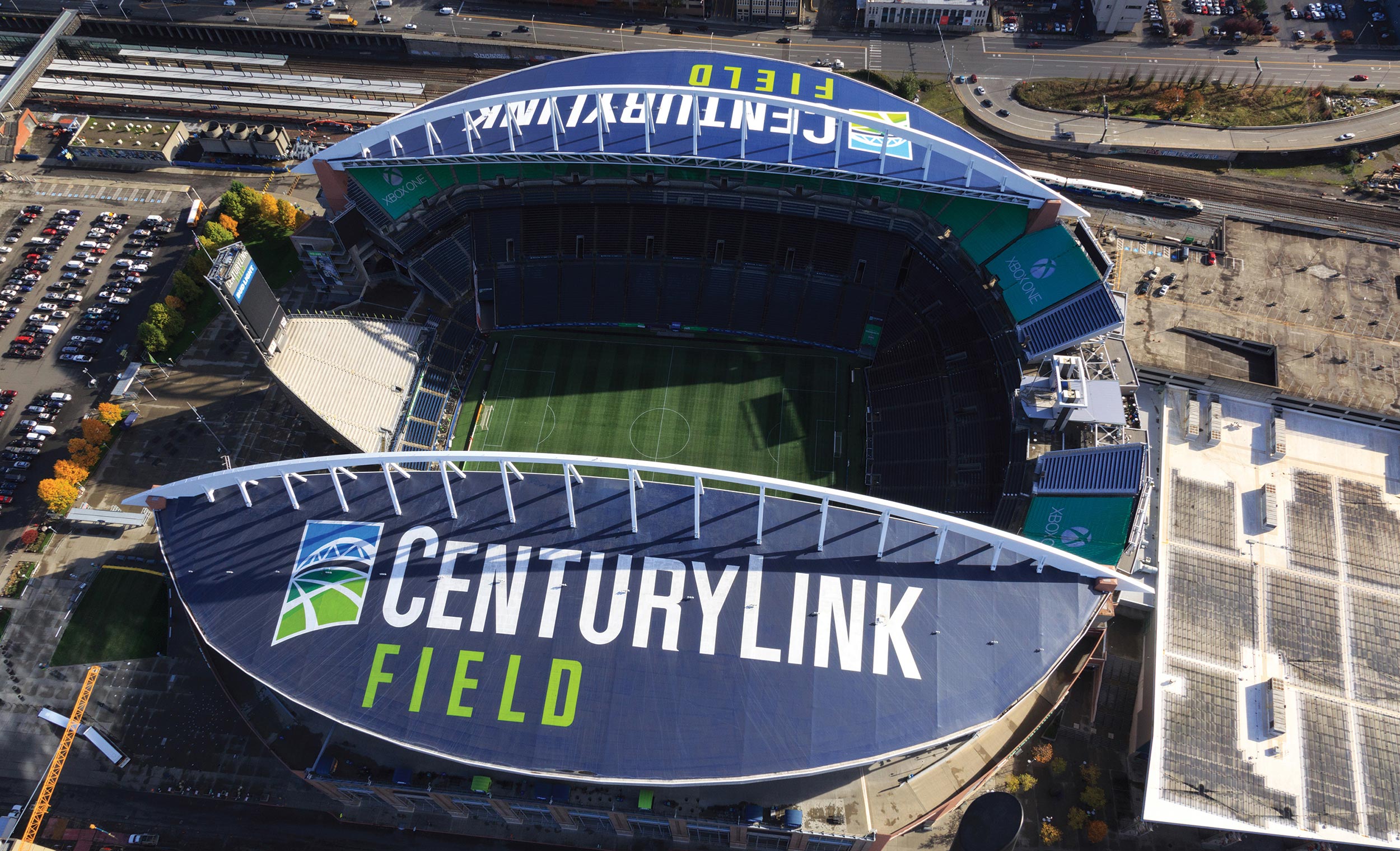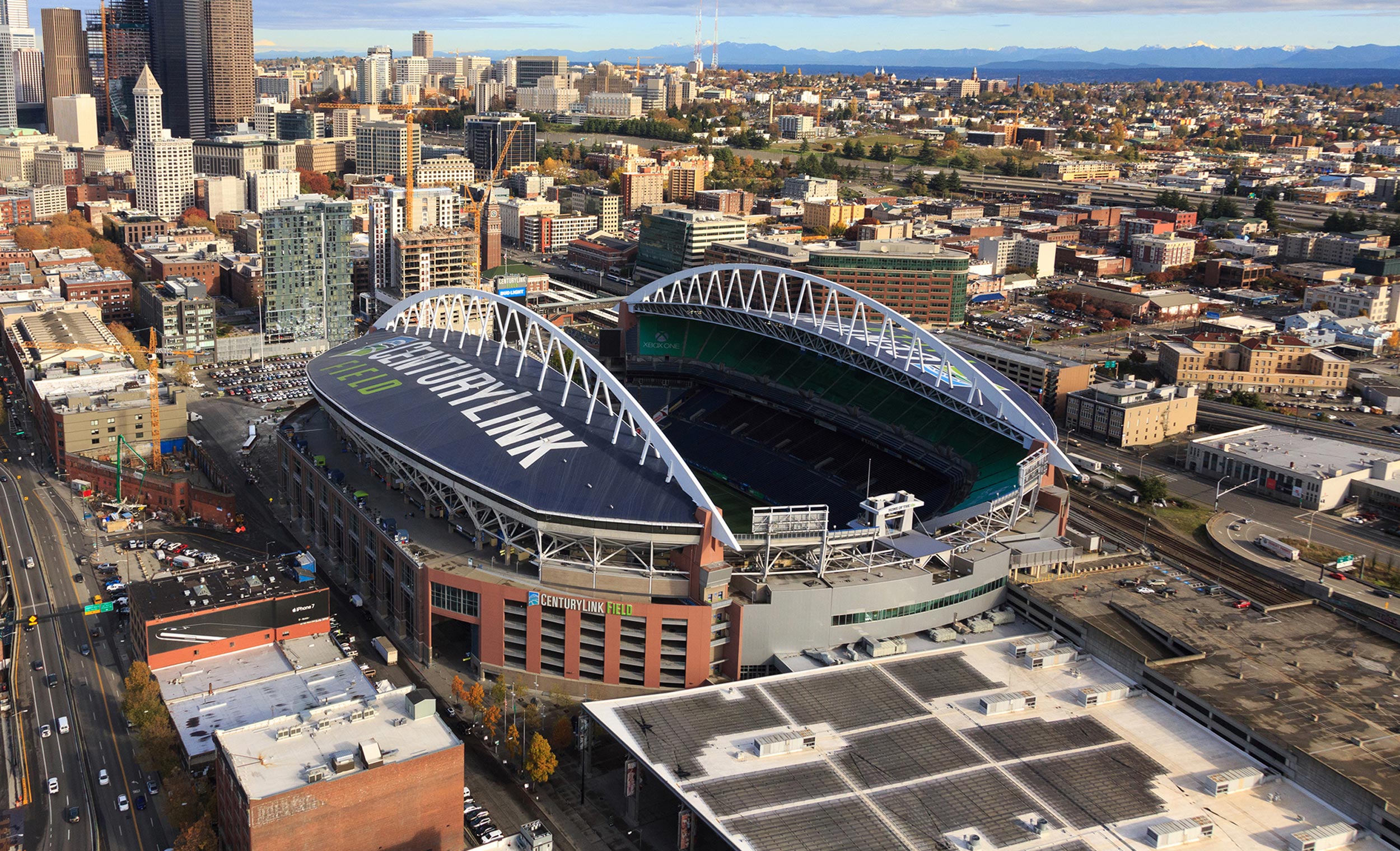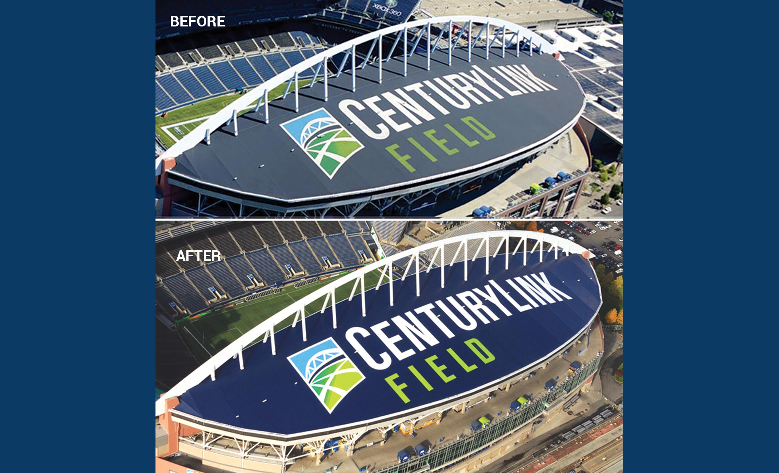 We were hired to refresh the graphics on the 180,000 square foot roof of CenturyLink Field. In addition to sealing the roof, we were charged with refreshing the roof graphics. The dark blue background of the graphic was susceptible to fading so we solved the problem by thinking outside of the box. Instead of using an expensive non-fade product, we saved the client money by using a PPG Direct to Metal 20 Year paint. A total of 1,200 gallons were used on the three month job.