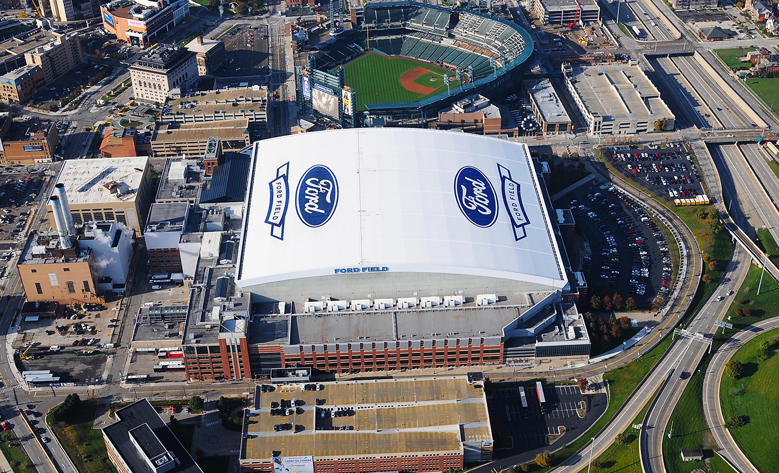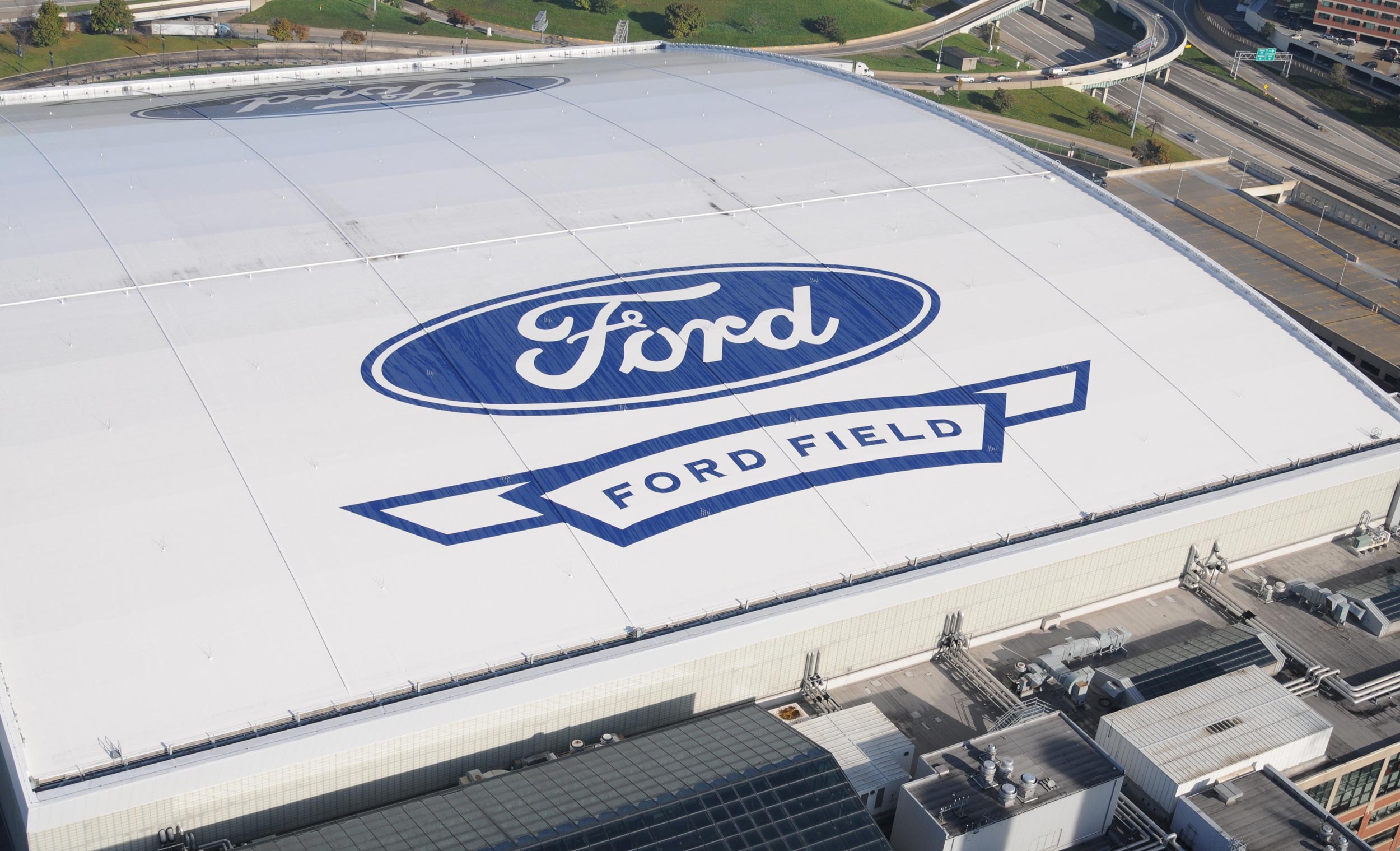 Ford Field Detriot, MI General Contractor: Tube Art We were hired to create two huge Ford logos on the roof of Ford Field. The layout of the iconic logo was critical to the success of the project. In under a month, using old world techniques, our craftsman took great care in creating the roof graphics. In the end we covered 64,000 square feet using a 20 Year Rust-oleum roof coating.